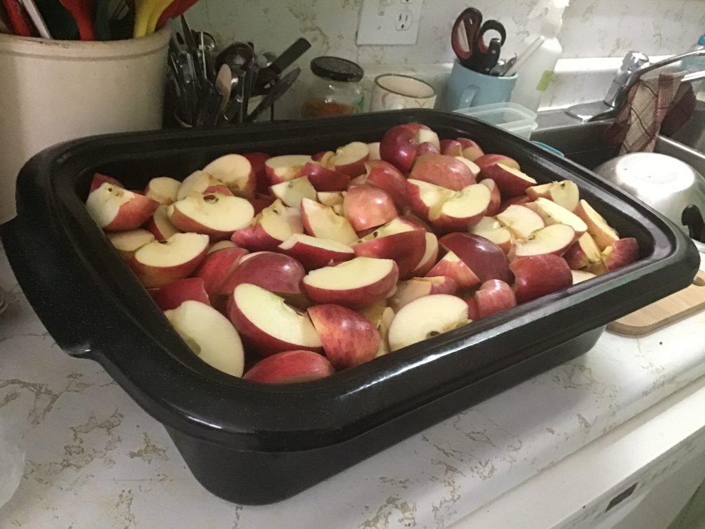 I had anticipated no further large canning projects this season, with the exception of applesauce. Ontario Gala apples went on sale at the grocery store this week, so we bought a half bushel. This morning we washed them, removed the stems and blossom ends, quartered them, and partially cooked them in the electric roasting pan with 3 cups of apple juice.