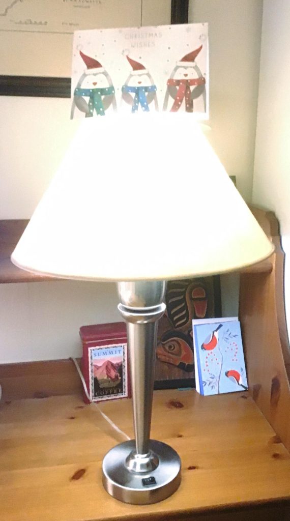 In the photograph above is the surprise in the mailbox card. On a sudden whim I placed it on top of the lampshade. It lights up from below and is quite cheerful. There is no heat from the bulb, the LED bulbs are good that way. The widowed neighbour’s card sits on the other lamp. My Mom’s envelope sits unopened on the Christmas tree, to be opened on Christmas Day.