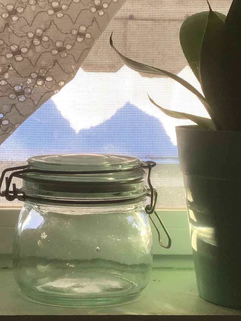 Yesterday’s snow decorations hanging from the awning outside the kitchen window.