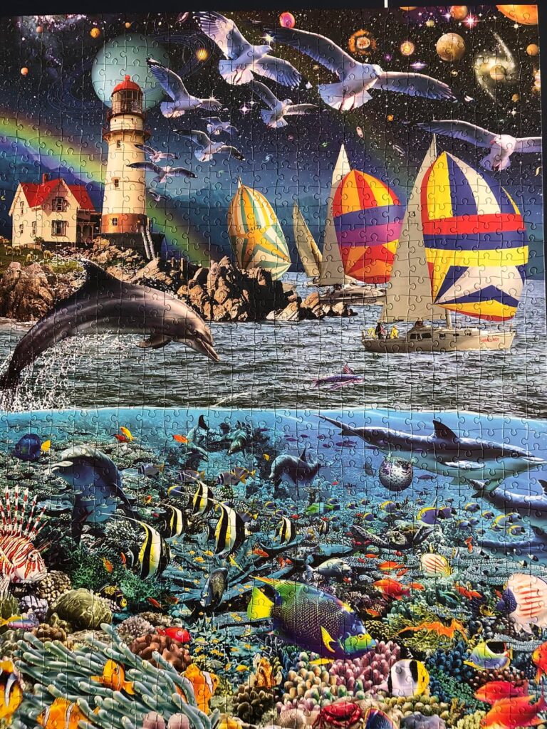 Our current jigsaw puzzle is almost done. We both work on it off and on during the day, for very short periods of time while we are waiting for a kettle to boil or a timer to go go off, or just passing by the table. The current puzzle is by Cardinal, and is called Slice of Life. We bought it at the charity shop, and have really enjoyed this one.